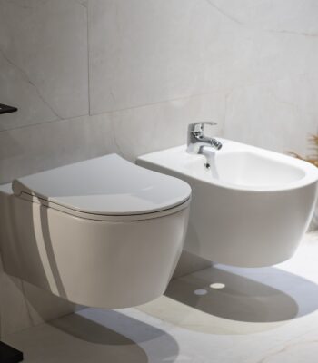 Set WC + Bide rimless, model wall-hung (sospeso), me dizajn modern dhe linja të pastra.